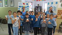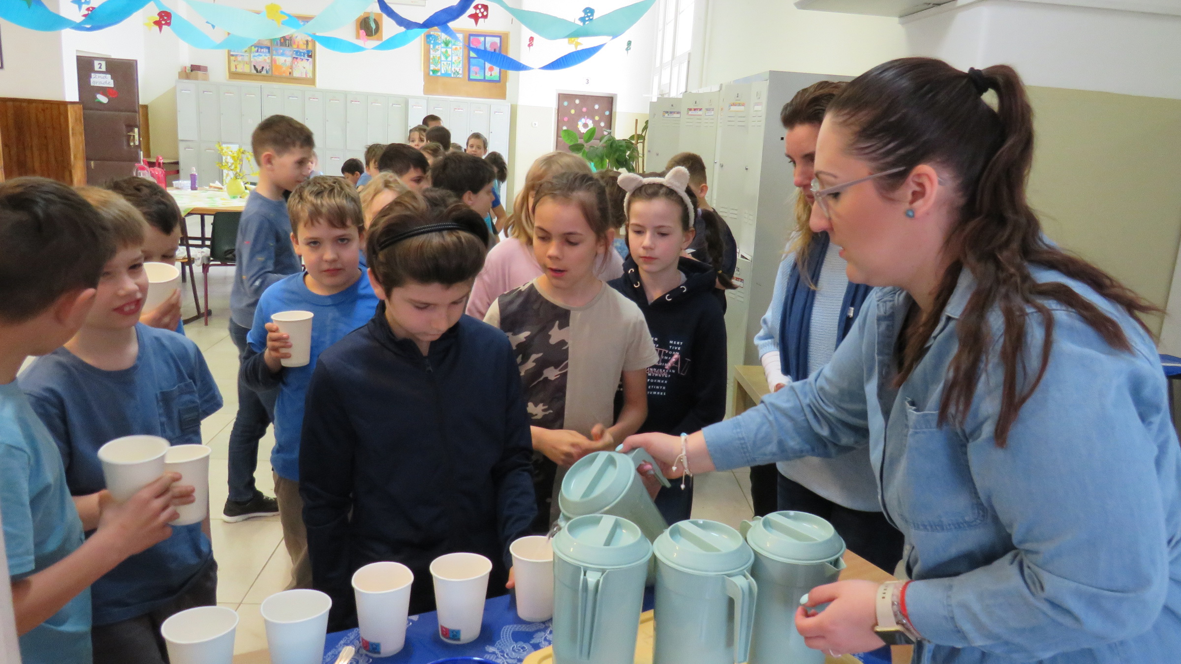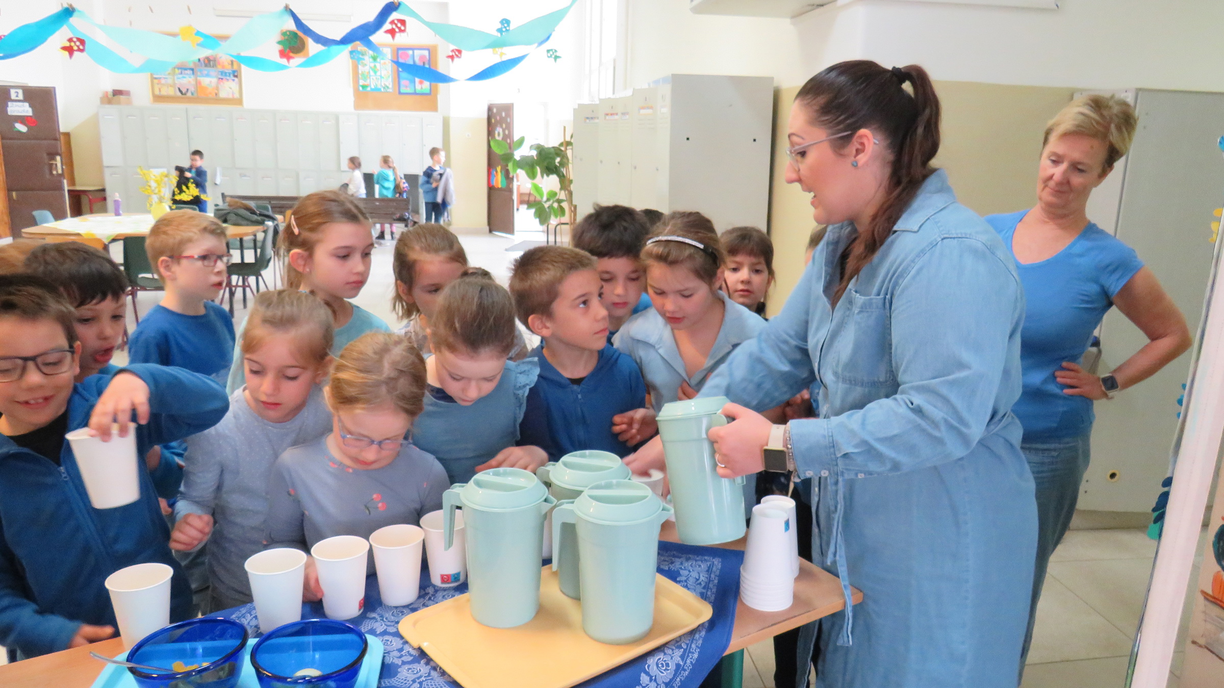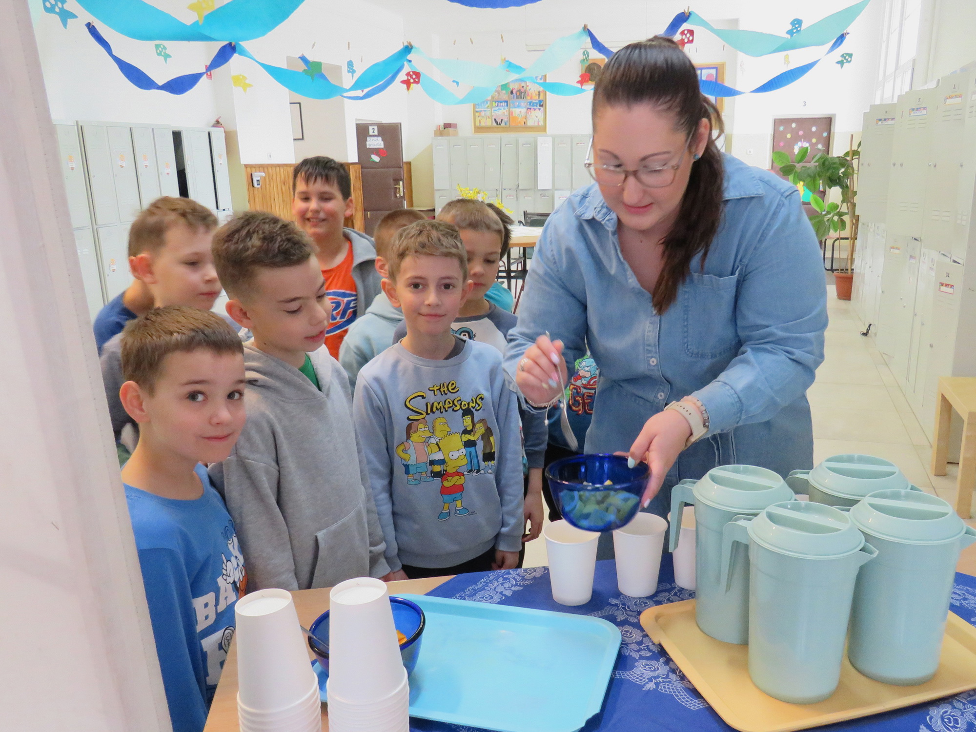 A program hangulatát tovább emelte, hogy kék ruhába öltöztünk, ezzel is szimbolizálva a víz tisztaságát és fontosságát. Emellett plakátokat is készítettünk, amelyeken érdekes információk, figyelemfelkeltő rajzok és hasznos tanácsok szerepeltek a vízfogyasztással kapcsolatban.