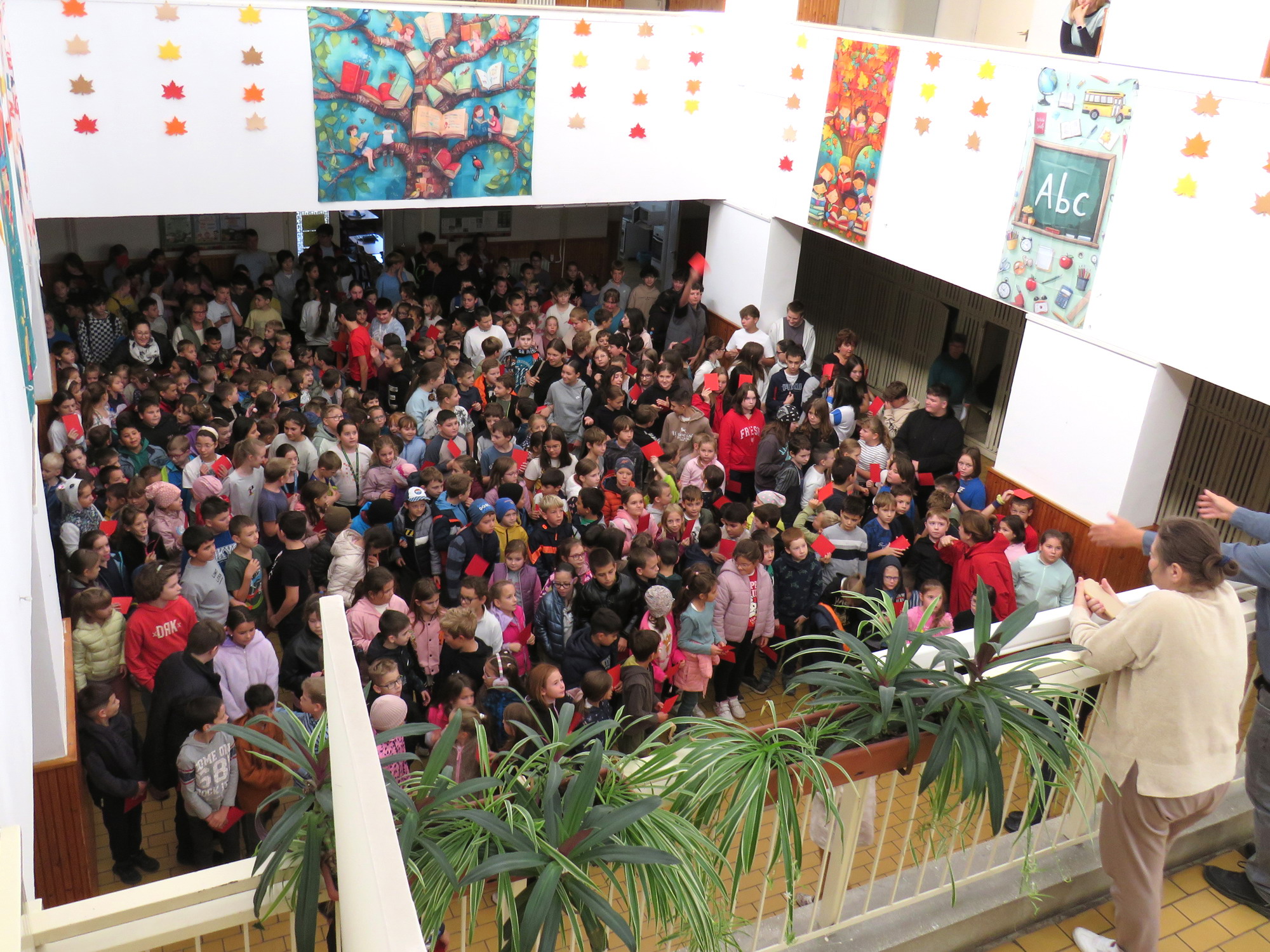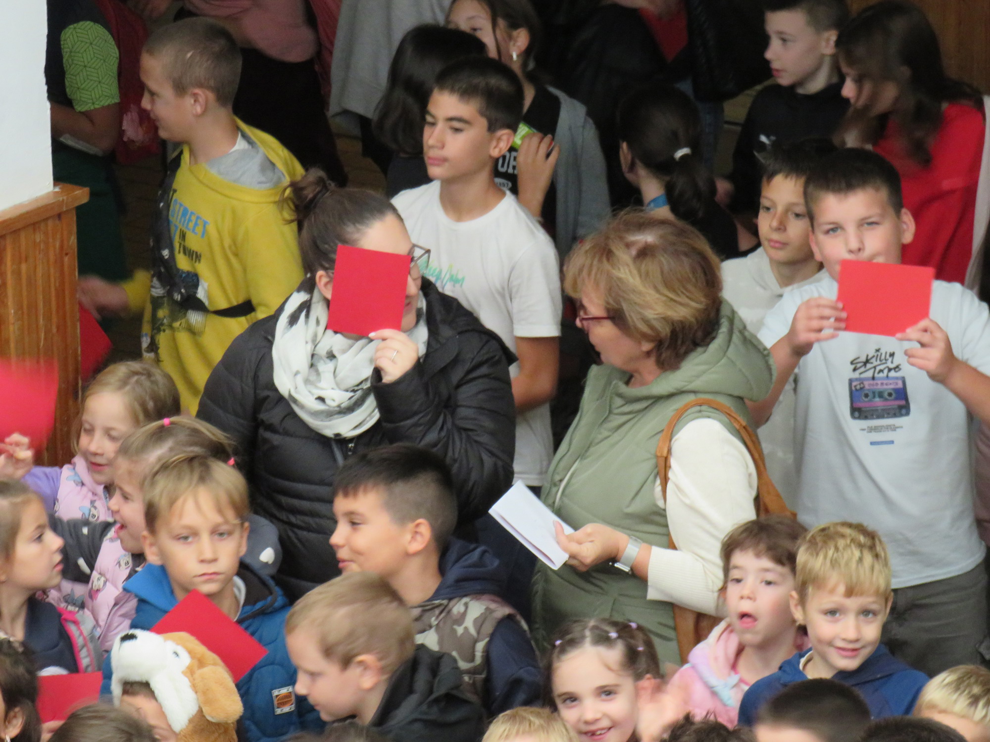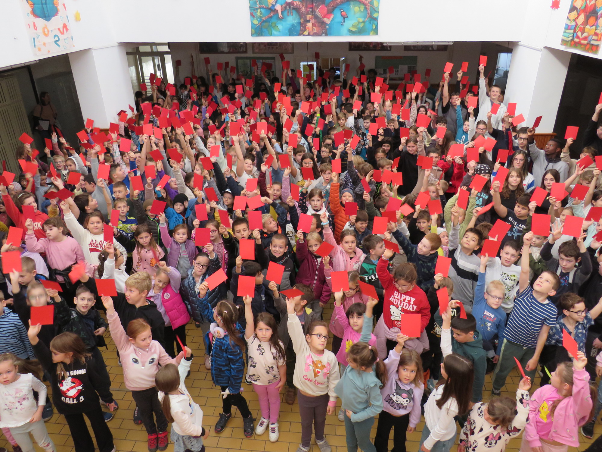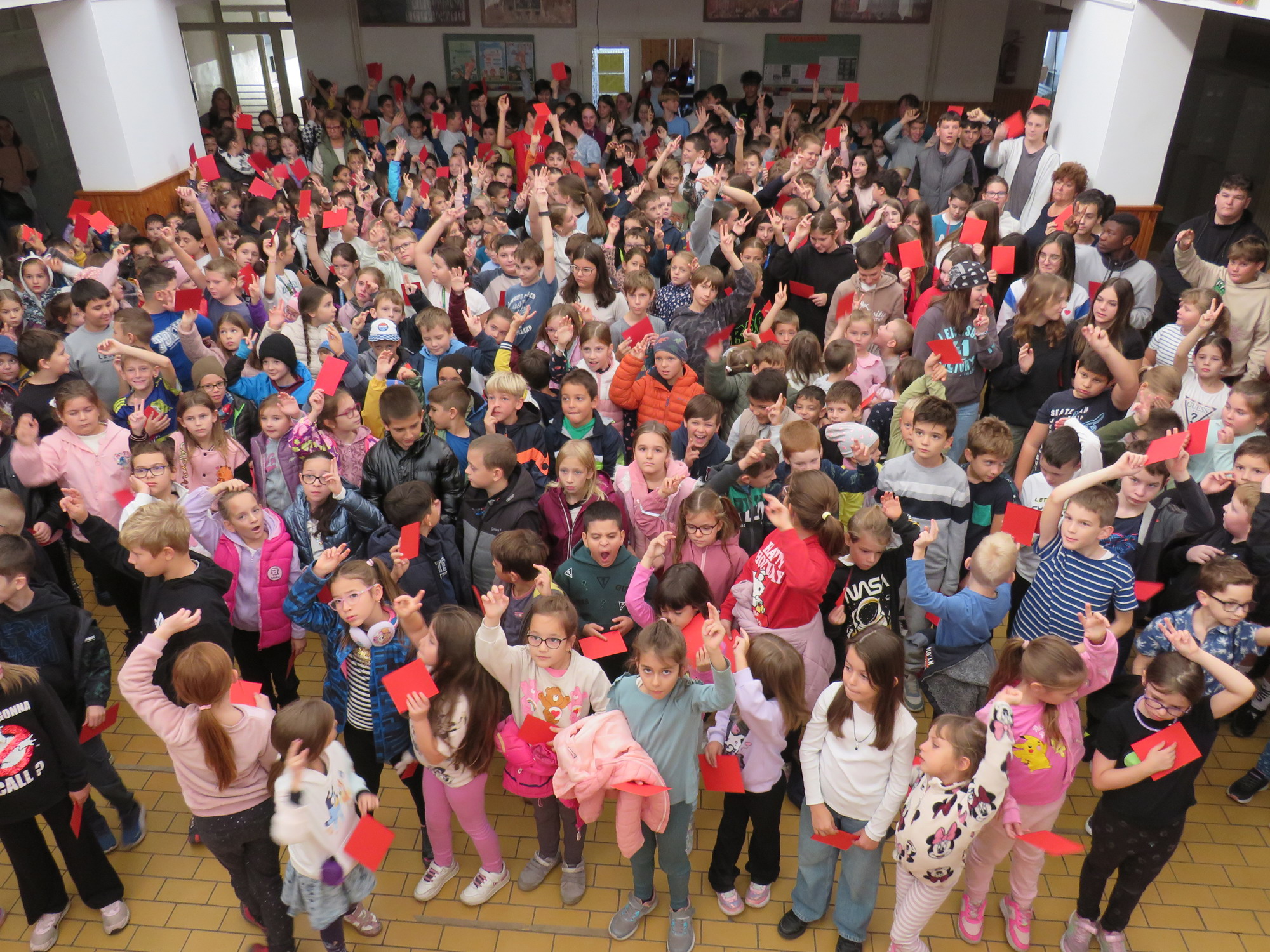 A megmozdulás keretében iskolánk tanulói egy pár perc erejéig felsorakoztak a nagyiskola aulájában. Miután Drobenák Katalin igazgatónő pár mondatban rávilágított arra mit is jelent az erőszak, illetve mi a célja, hogy összegyűltünk, tanulóink elsőtől nyolcadikig egyszerre mutatták fel a kezükben tartott piros lapot.