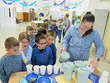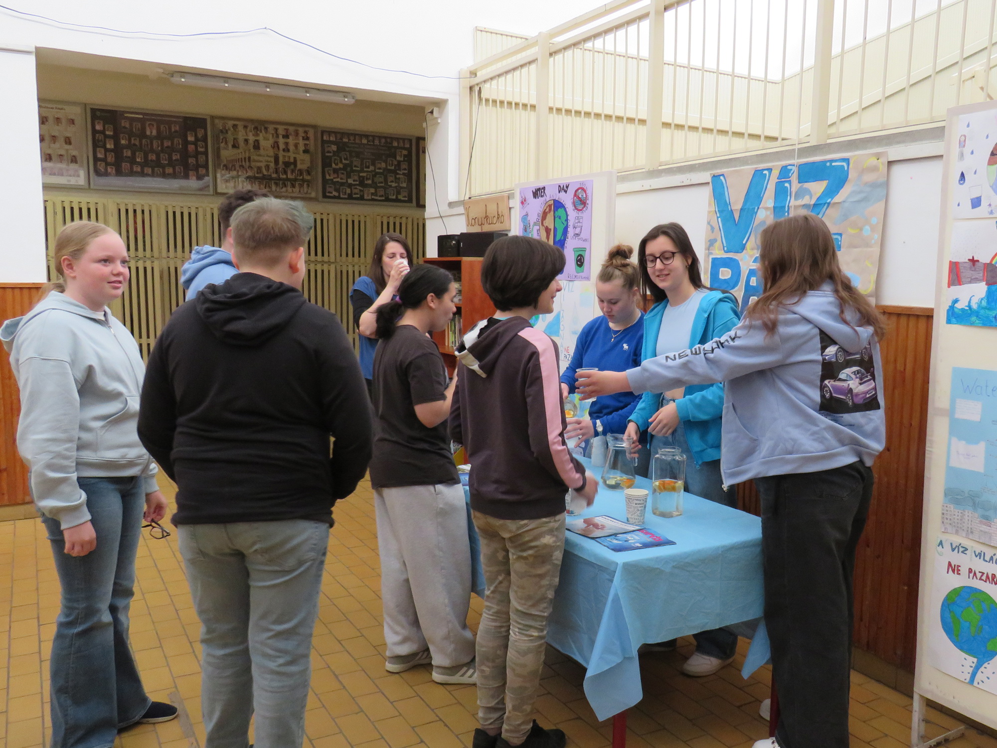 A program hangulatát tovább emelte, hogy kék ruhába öltöztünk, ezzel is szimbolizálva a víz tisztaságát és fontosságát. Emellett plakátokat is készítettünk, amelyeken érdekes információk, figyelemfelkeltő rajzok és hasznos tanácsok szerepeltek a vízfogyasztással kapcsolatban.